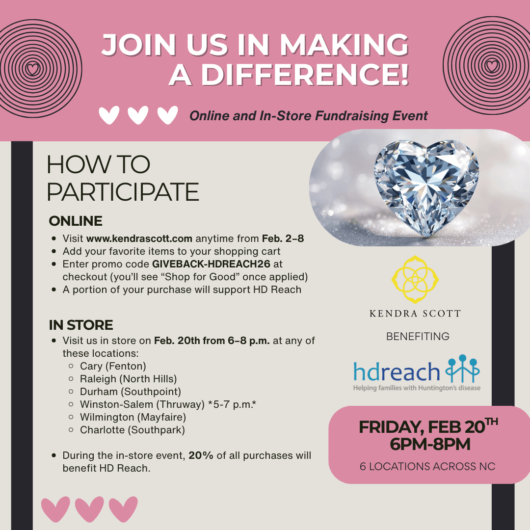 Join us for a Kendra Scott Give Back Fundraiser supporting HD Reach. Thank you to all who are participating!